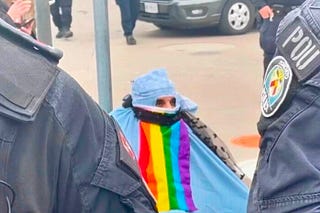 A man dressed in a blue bed sheet fashioned as a Muslim Niqab, draped with a pride flag, was reportedly detained for an hour while police “consulted” on…