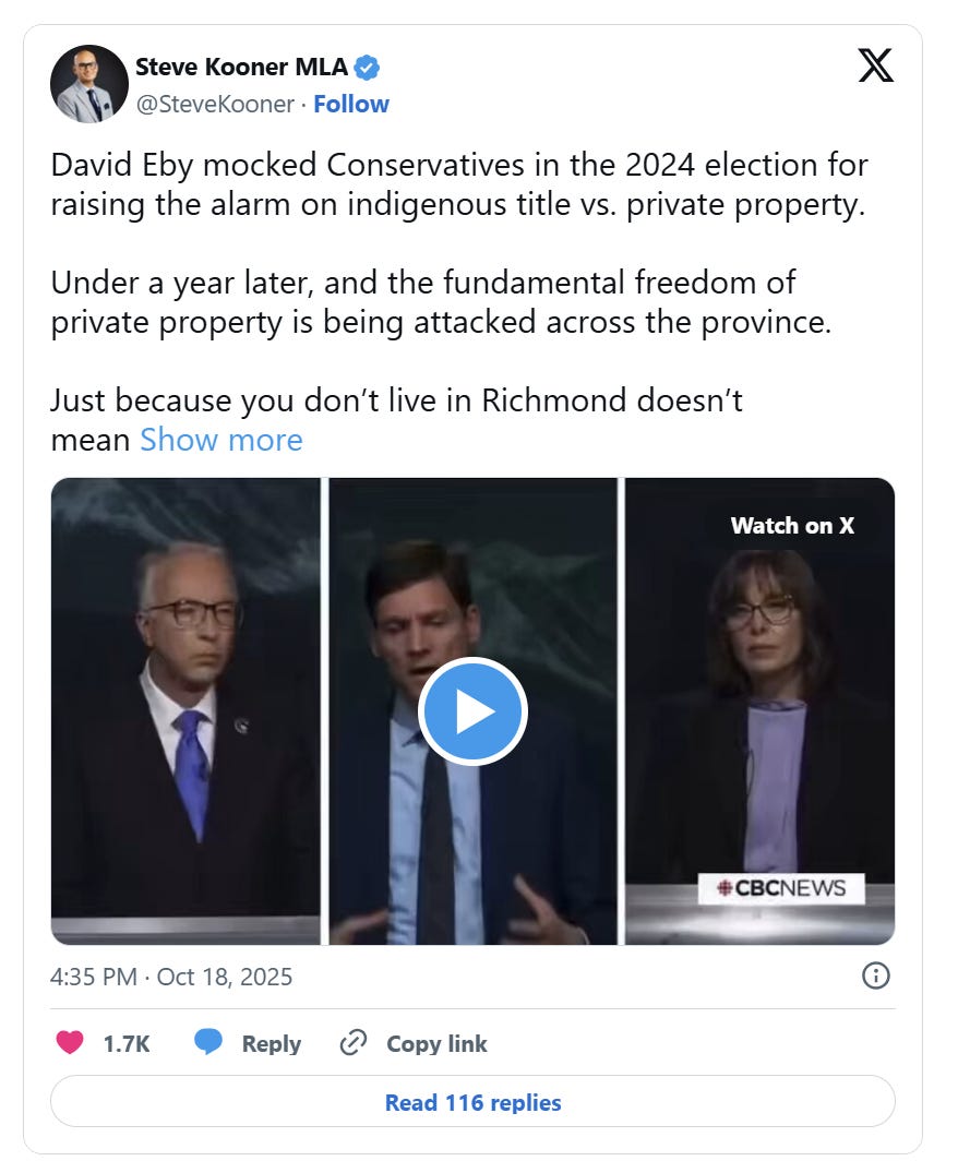 “Premier Eby has a choice to make,” Rustad said in his X post, urging the premier to “stand for private property rights” or to “continue to sew division, distrust, and divestment in BC.”