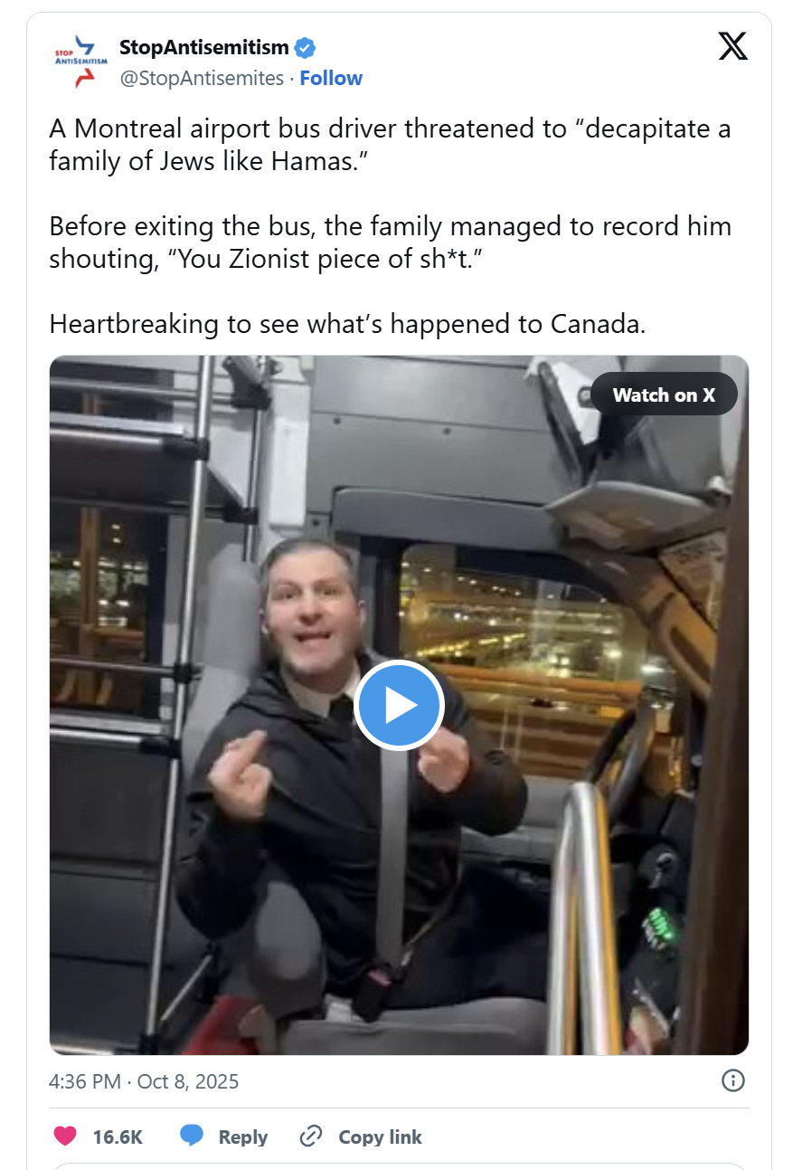 A Montreal airport bus driver threatened to “decapitate a family of Jews like Hamas,” the X account alleged. “Heartbreaking to see what’s happened to Canada.”