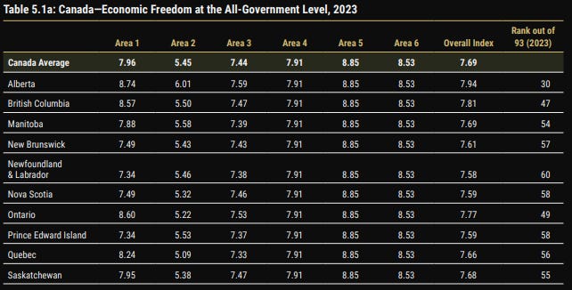 The study noted that seven of the 10 Canadian provinces ranked below all 50 U.S. states in terms of government economic freedom.