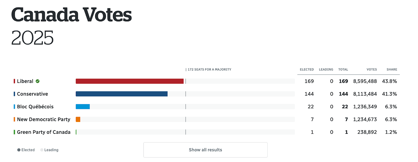 The Liberals had 169 on election night, plus three turncoat Conservatives and the recent NDP addition put Carney’s Liberals at 173.