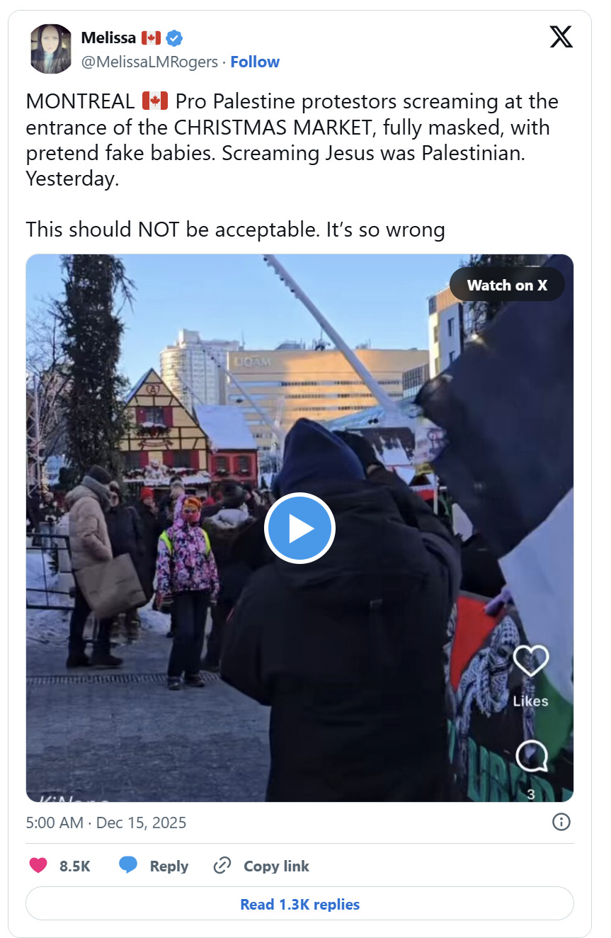 Toronto wasn’t the only place in Canada where anti-Israel activists protested holiday events for non-Muslim religions. One video shared online by commentator Melissa Rogers showed pro-Palestine activists standing in front of a Christmas market in Montreal, calling Jesus a Palestinian.