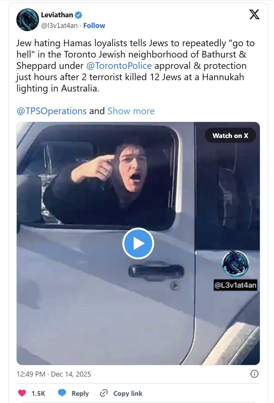 In a post on X, Leviathan noted that Bondi Beach in Australia shares a resemblance to the corner of Bathurst and Sheppard in Toronto, as it’s a spot where pro- and anti-Israel demonstrations have taken place every Sunday. The X user warned that the terrorist attack which happened at Bondi Beach could take place in Toronto if police are not careful.
