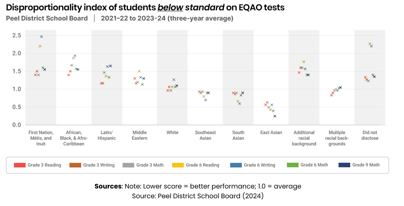 Lau notes that school board data contradict the OHRC’s narrative. Results from Peel District School Board and Waterloo Catholic District School Board show that East Asian, South Asian, Southeast Asian, and Latin students frequently outperform white students on standardized tests.
