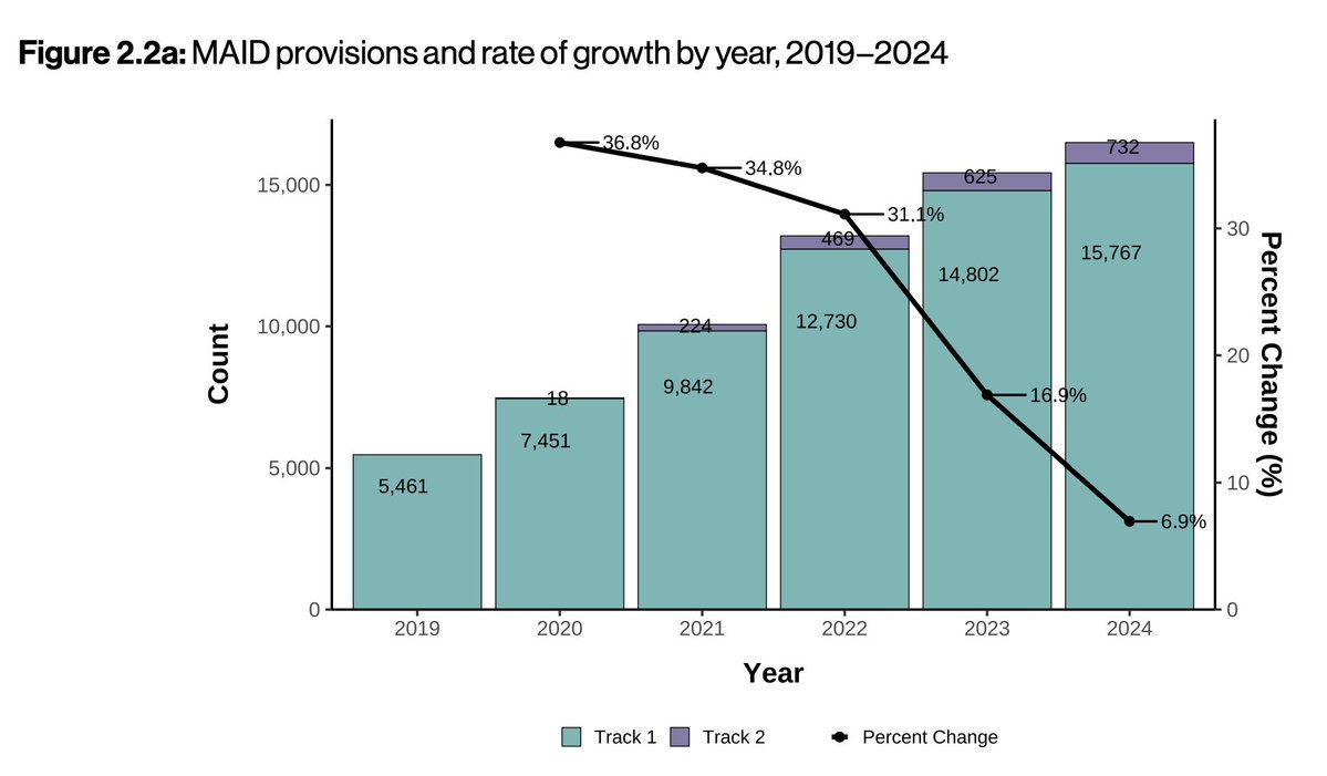 Despite the continued yearly increase of state-sanctioned suicides, the annual growth rate in the number of MAiD provisions increased at a slower rate between 2023 and 2024 than in previous years.