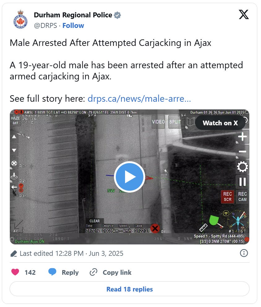Durham Regional Police Service posted a video to X showing the pursuit and dramatic takedown. The post also noted that the suspect “was out on bail” before the alleged offences.