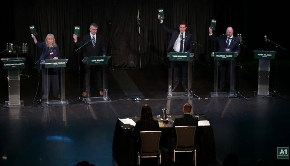 The B.C. Conservative leadership debate turned to a series of rapid yes-or-no questions, pressing candidates on SOGI 123, DEI hiring, land acknowledgements, and the future of the province’s human rights tribunal.