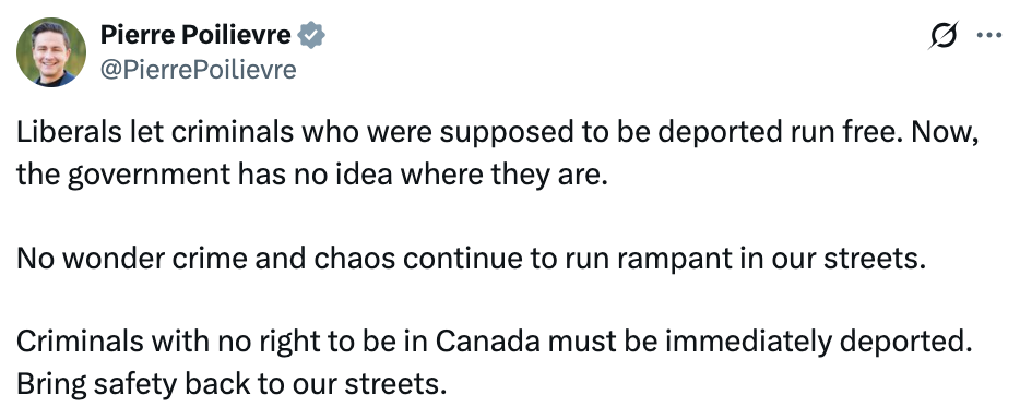 “Liberals let criminals who were supposed to be deported run free. Now, the government has no idea where they are. No wonder crime and chaos continue to run rampant in our streets,” said Poilievre.