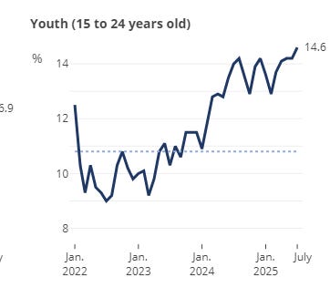 Youth employment fell by 34,000 jobs last month, a 0.7% decline, bringing the rate to 53.6%. Excluding the COVID-19 pandemic years of 2020-21, July marked the lowest youth employment rate since November 1998.