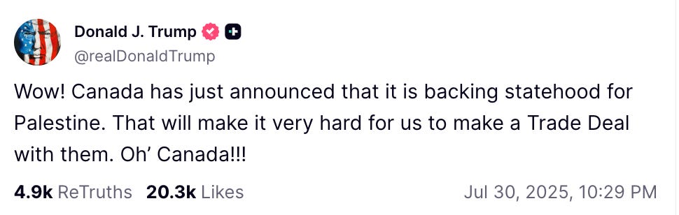 “Canada intends to recognize the State of Palestine at the 80th session of the United Nations General Assembly in September 2025,” Carney said.