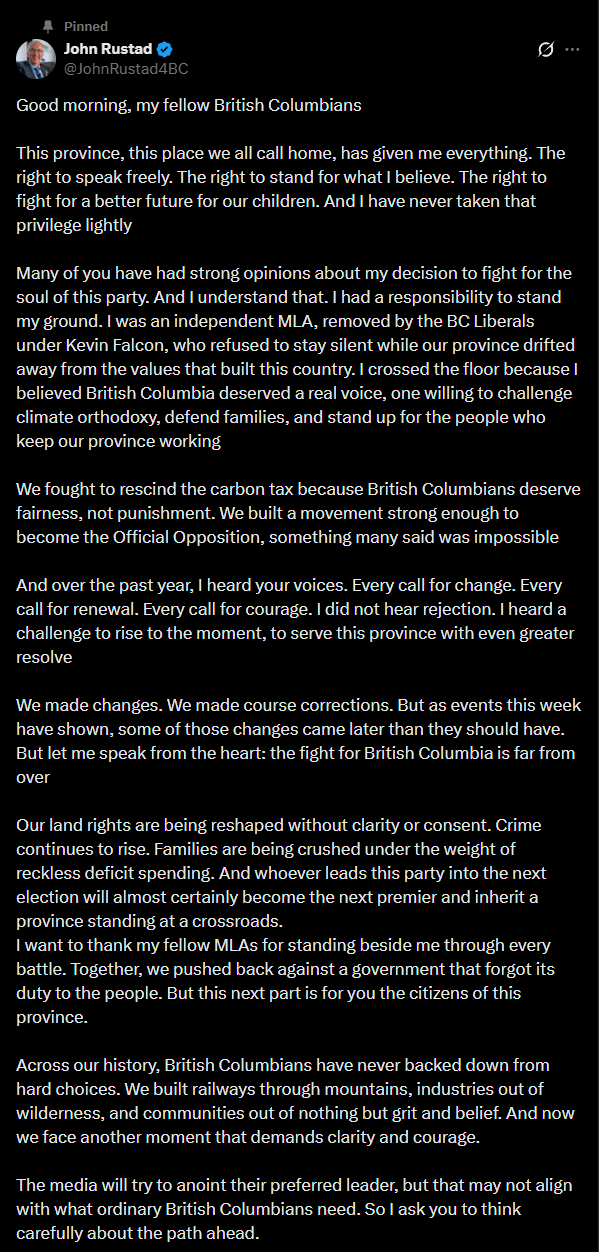 But all of that shifted on Thursday morning, when Rustad signalled his resignation by quietly changing his X profile by replacing his title as “leader of the BC Conservatives” to “MLA for Nechako–Lakes.”