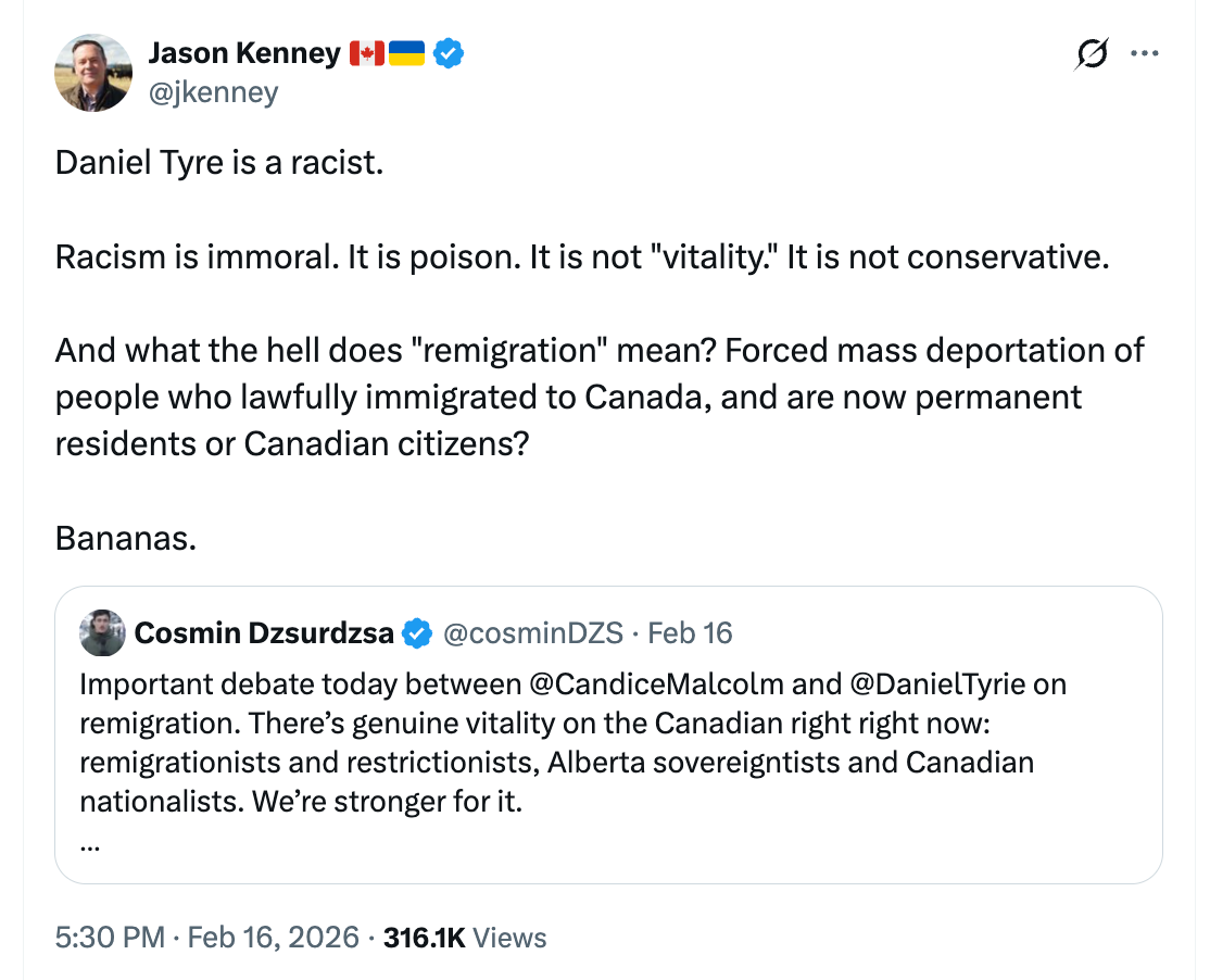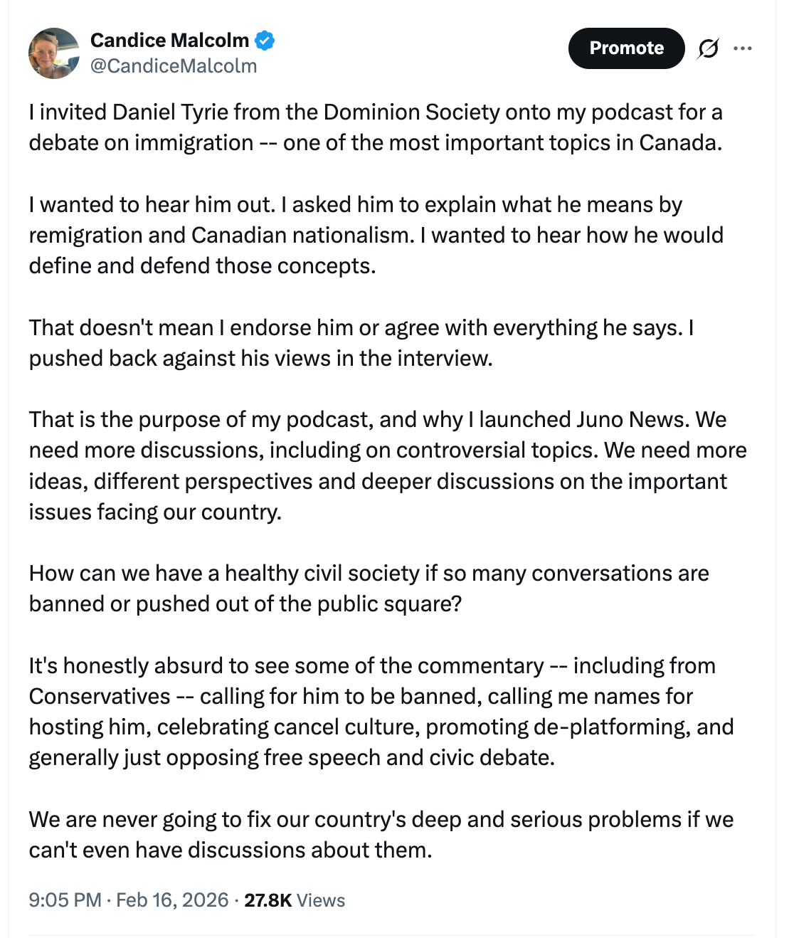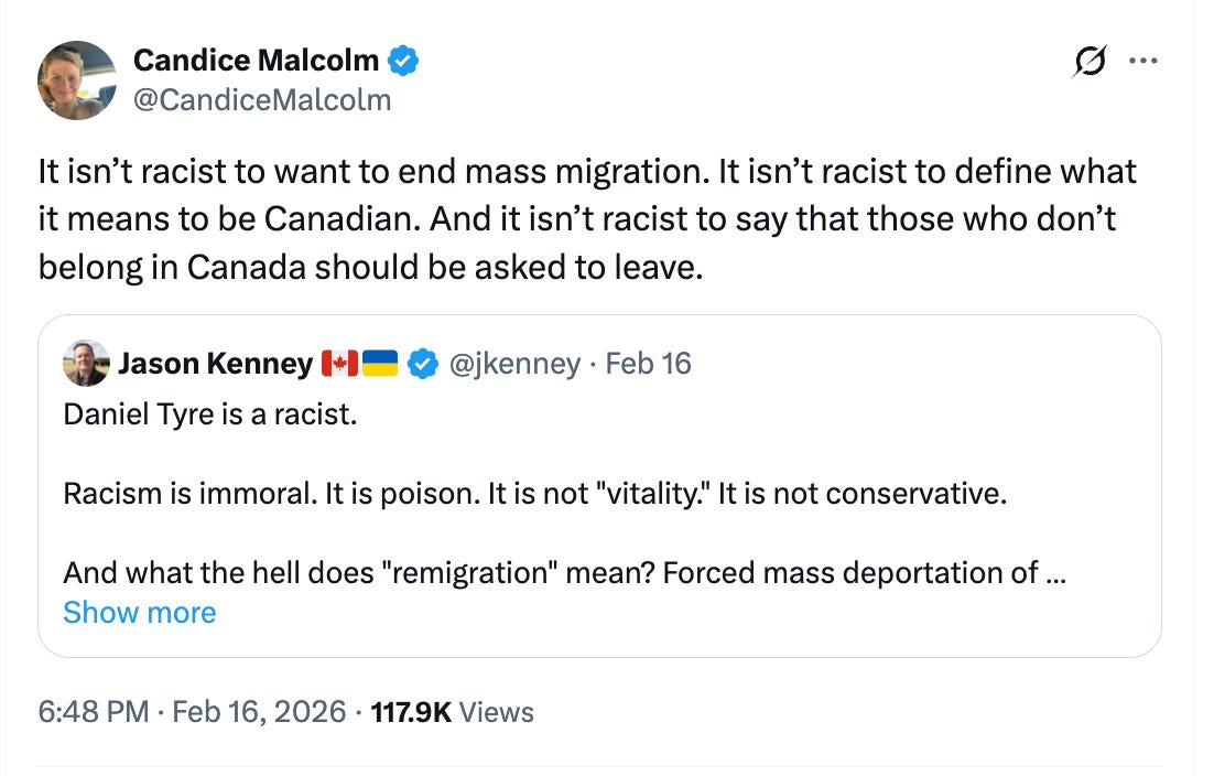For the record, Candice states that she does not agree with Daniel Tyrie on the strict ethnic definition of a Canadian, and she doesn’t endorse a remigration policy of trying to deport legal citizens out of Canada. But a journalist’s job is not to agree or disagree with an interview subject, but instead to allow the audience to hear both sides and make up their mind.