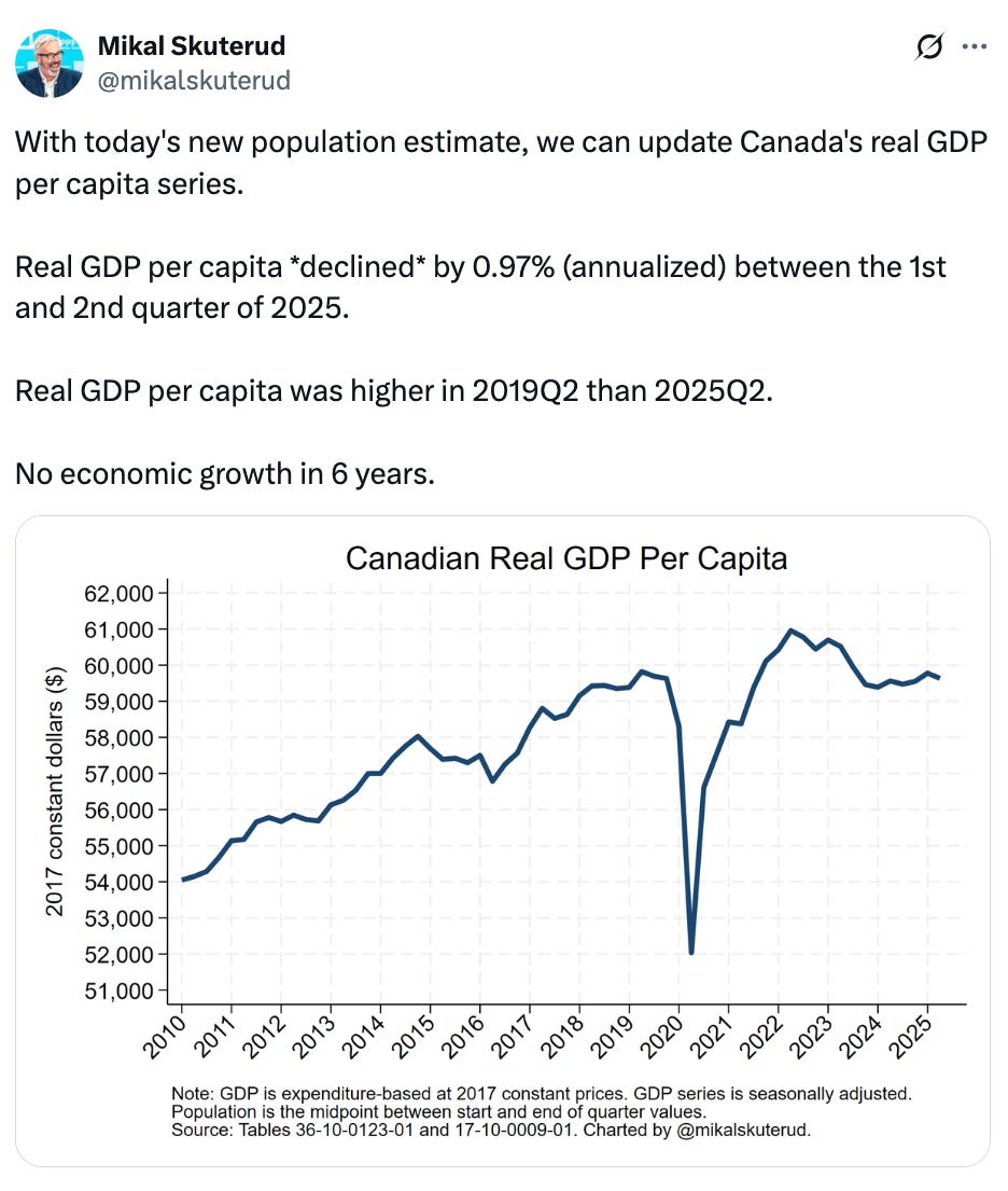 University of Waterloo Economist Mikal Skuterud noted Thursday that Canada’s real GDP per capita fell at an annualized rate of 0.97 per cent between the first and second quarters of 2025, according to updated population estimates.