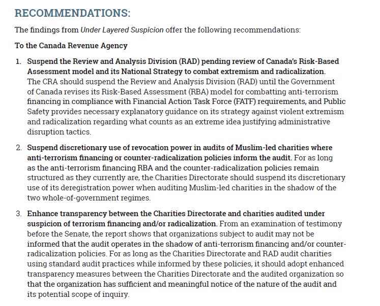 A 2023 Senate of Canada’s Standing Senate Committee on Human Rights Islamophobia report adopted similar conclusions. It said Muslim-led charities are “audited more frequently than others,” and called for “Independent review of CRA’s Review and Analysis Division,” recommending that “NSIRA undertake a review of this issue.” It also urged the government to combat “systemic Islamophobia” in national security agencies.