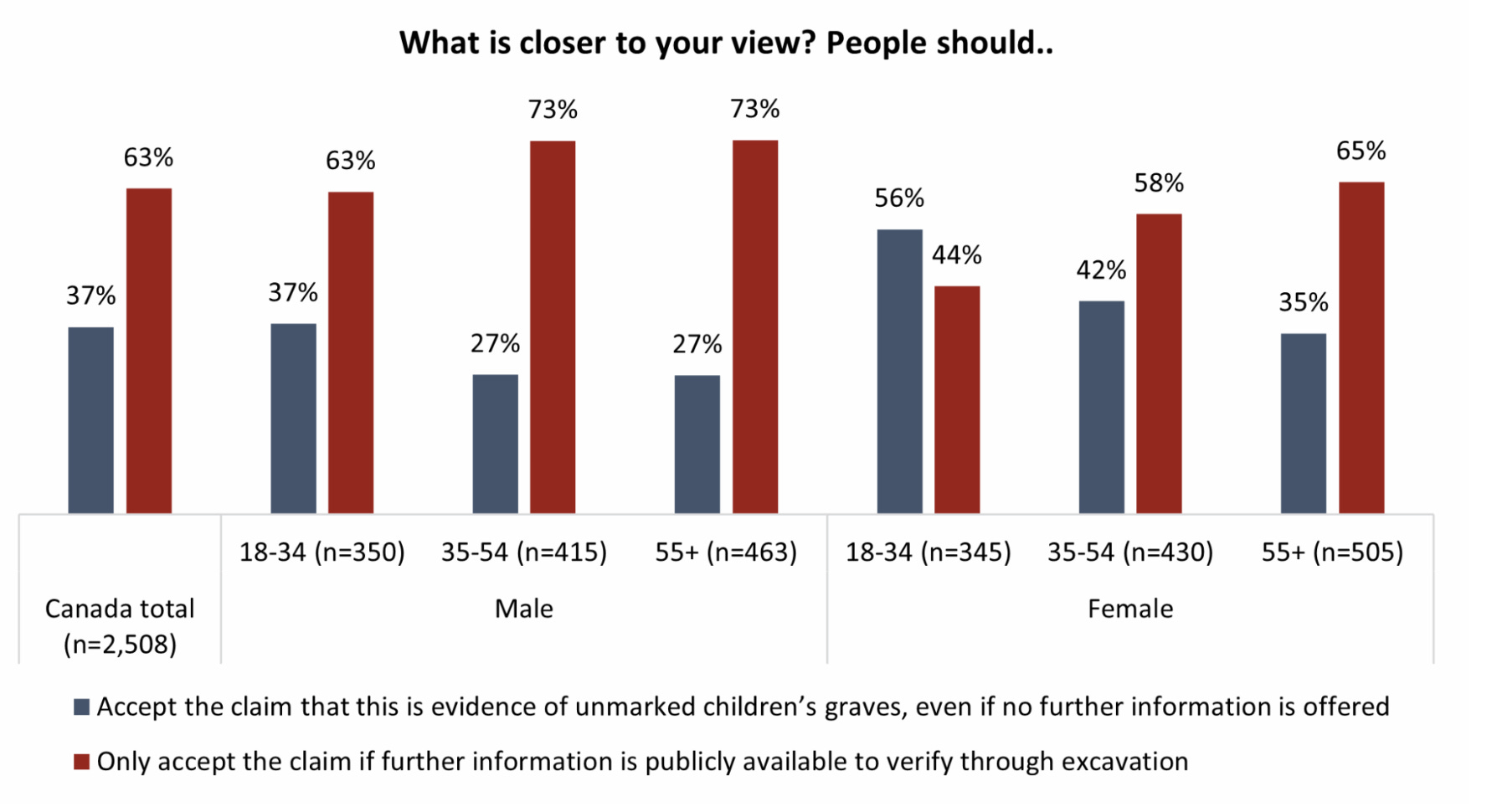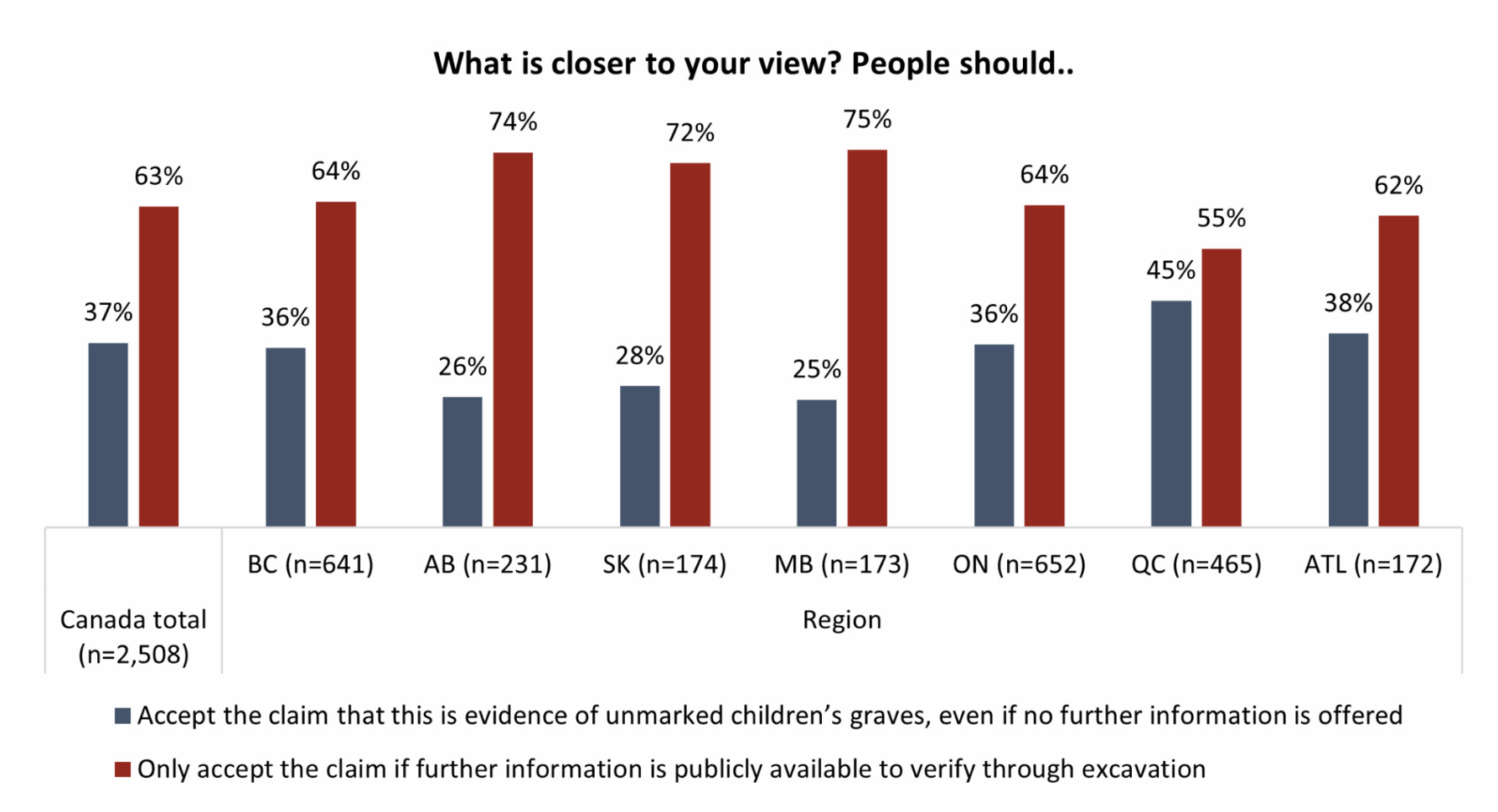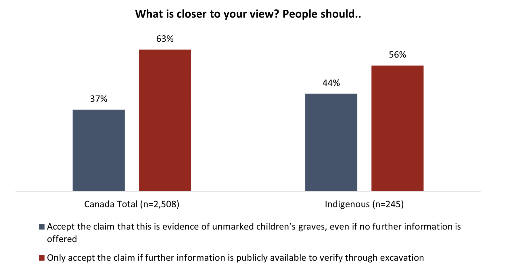 “Among Indigenous identifying individuals, more than half also feel that the claim should only be accepted with further proof, though they are more likely than others to say they’re satisfied with what has been offered already.”