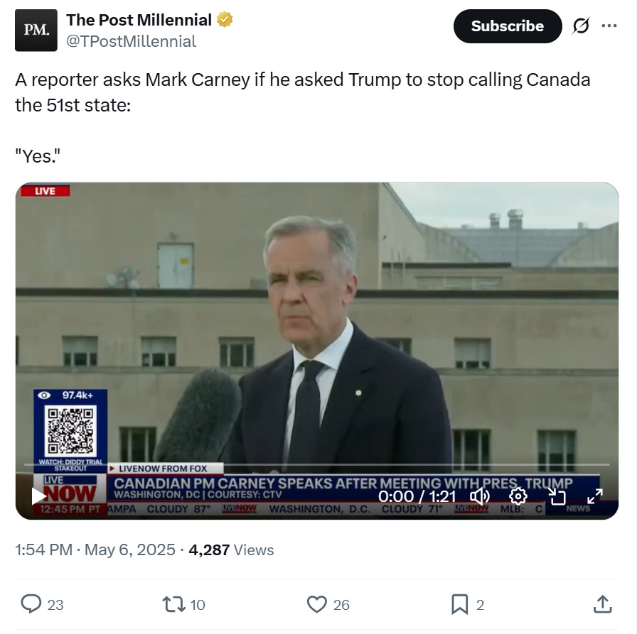Carney became defensive with reporters when questioned about Trump’s repeated references to Canada becoming the 51st state during the two leaders’ first meeting at the White House.