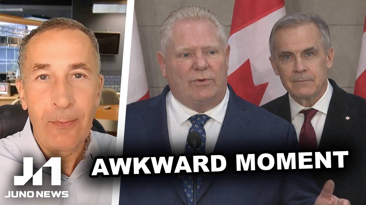 Doug Ford’s defence of his U.S. ad blitz draws a visible reaction from Carney as Canada–U.S. trade talks remain stalled.