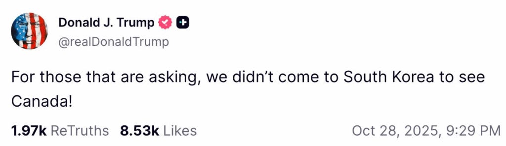 “For those that are asking, we didn’t come to South Korea to see Canada!” he wrote on Truth Social Tuesday evening.