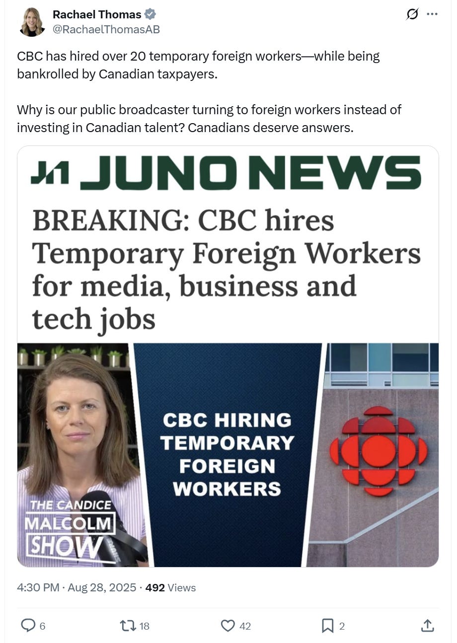 While Canadians face an affordability crisis, the taxpayer-funded CBC has been quietly hiring temporary foreign workers for jobs in Ontario, claiming no Canadians could be found to fill them.
