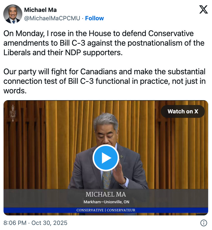 “They believe in a two-tier immigration system where citizenship by naturalization within our borders has harder requirements than Citizenship by Descent outside of our borders. They believe in distributing the privileges of Canadian citizenship abroad while offloading the cost and duties of citizenship to those who live coast to coast to coast,” Ma said. “They believe that Canadians of convenience should be able to wear the Team Canada Jersey without even putting time on our ice.”