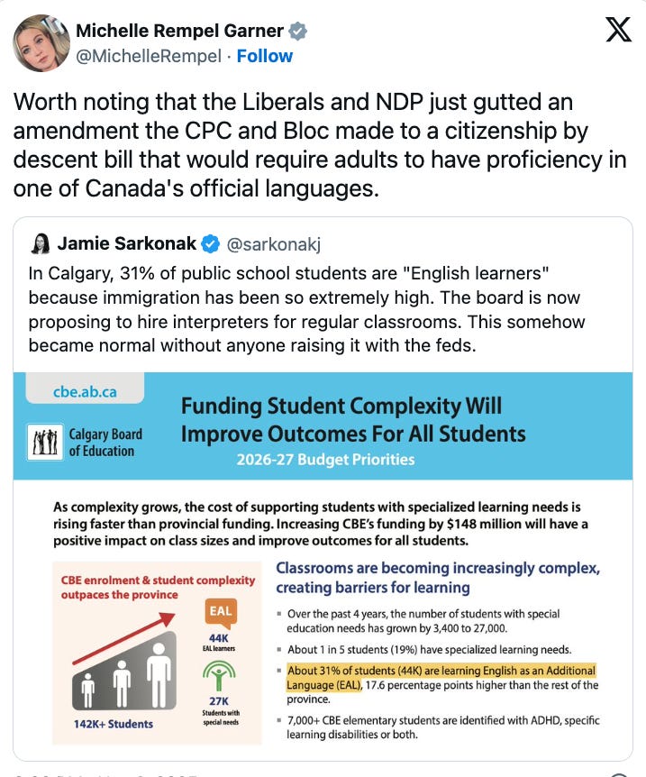 This comes after the Calgary school board asked for $148 million, in part, to support the nearly one-third of its students who need assistance “learning English as an additional language.” The Calgary Board of Education asked its provincial government to help fund “interpreters” to be in every regular classroom, as eight out of an average 28-student class lack proficiency in English.