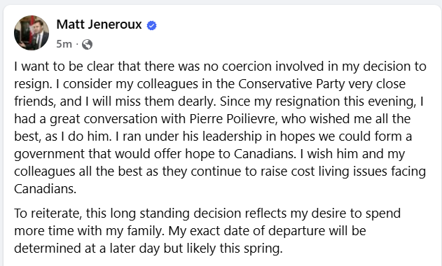 Conservative MP Matt Jeneroux announced his resignation from his role as MP for Edmonton Riverbend on Thursday, though he will not join the Liberals as previously rumoured.