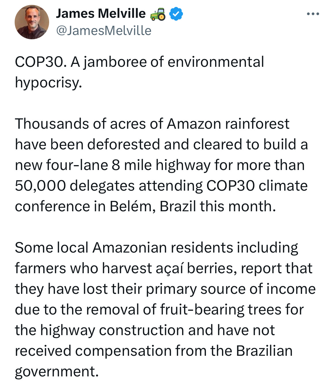 Tens of thousands of acres of rainforest and wetlands were destroyed to construct a “sustainable” four-lane highway earlier this year for the climate summit, which began on Thursday.