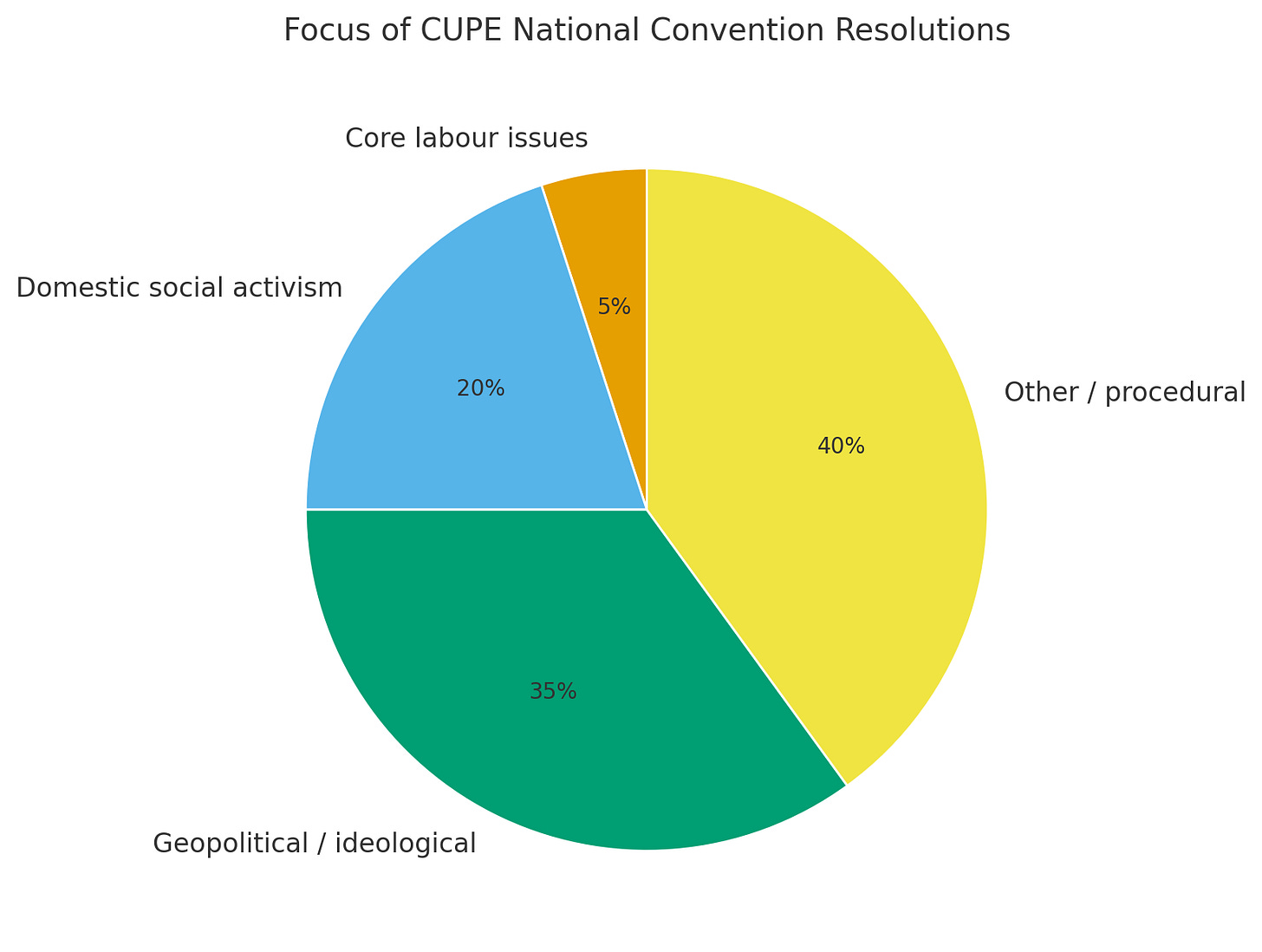 Analysis of the CUPE constitutional amendments and resolutions revealed that fewer than one in ten resolutions addressed the everyday concerns of members—issues such as wages, pensions, or workload. In contrast, roughly a third of the agenda was consumed by geopolitics and ideological campaigns.