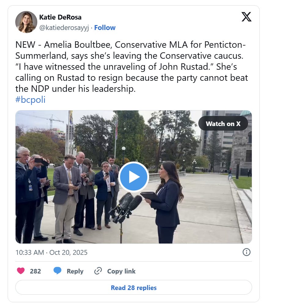 “I believe John Rustad is a decent man, with a horrible judge of character. I don’t know who advised him on his response to Amelia Boultbee, but I suspect it was the BC United portion of our caucus.”