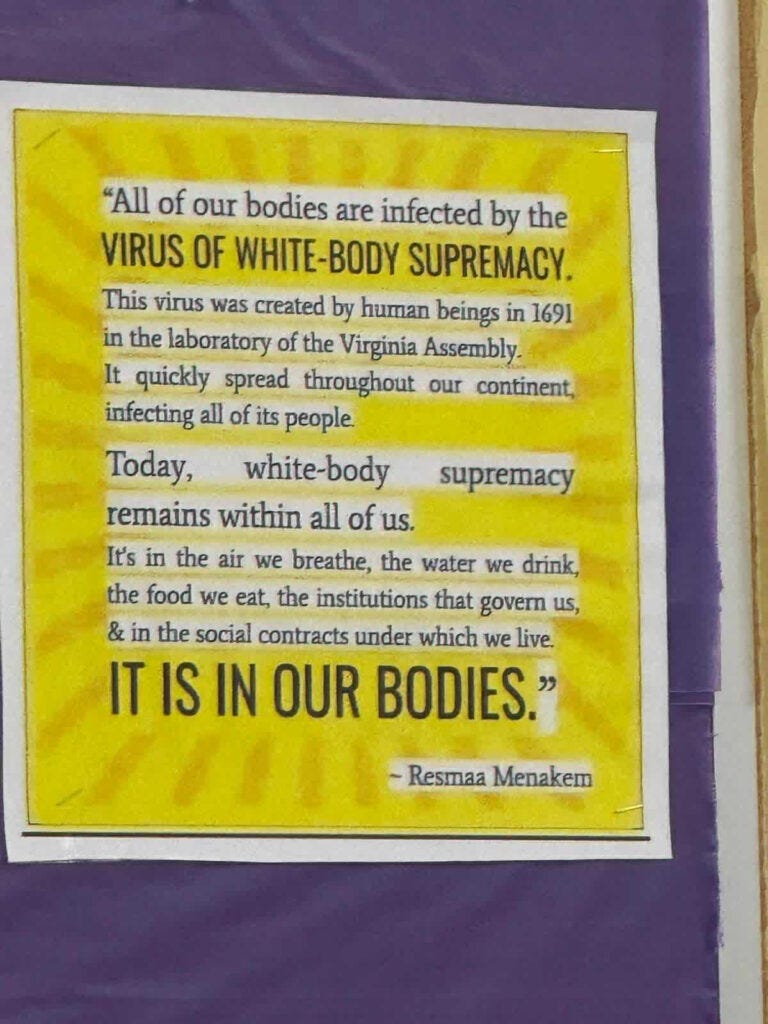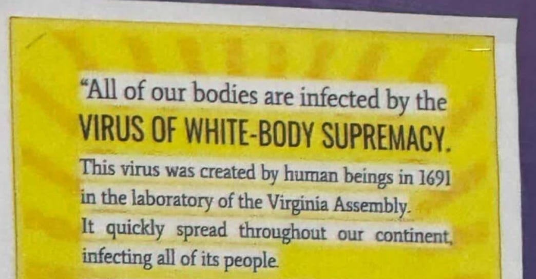 “All of our bodies are infected by the virus of white-body supremacy.” That’s the message printed on a large classroom poster displayed in a Grade 9 English.