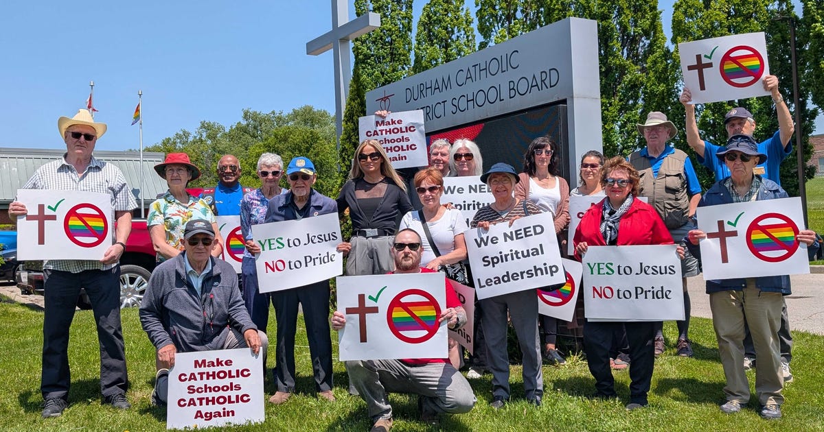 Protesters gathered in seven cities across Ontario for “pray-ins” at Catholic school administrative buildings, urging boards to refrain from supporting the LGBT movement and flying the Pride flag.