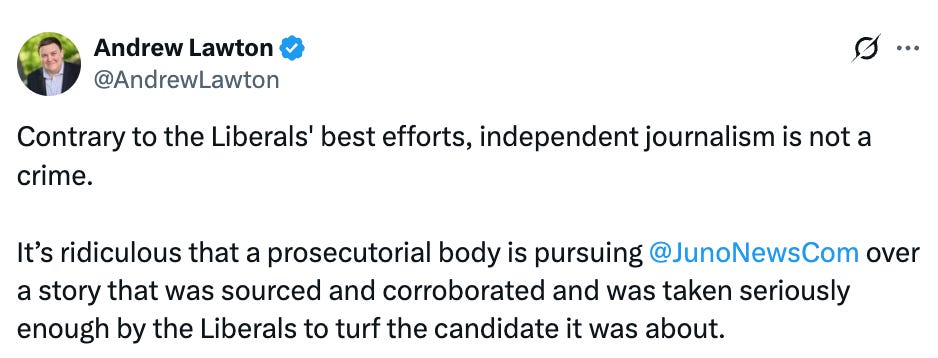 Conservative MP for Elgin—St. Thomas—London South, and former True North independent journalist Andrew Lawton posted on X Wednesday that the investigation into Bexte was "ridiculous” and that “journalism is not a crime.”