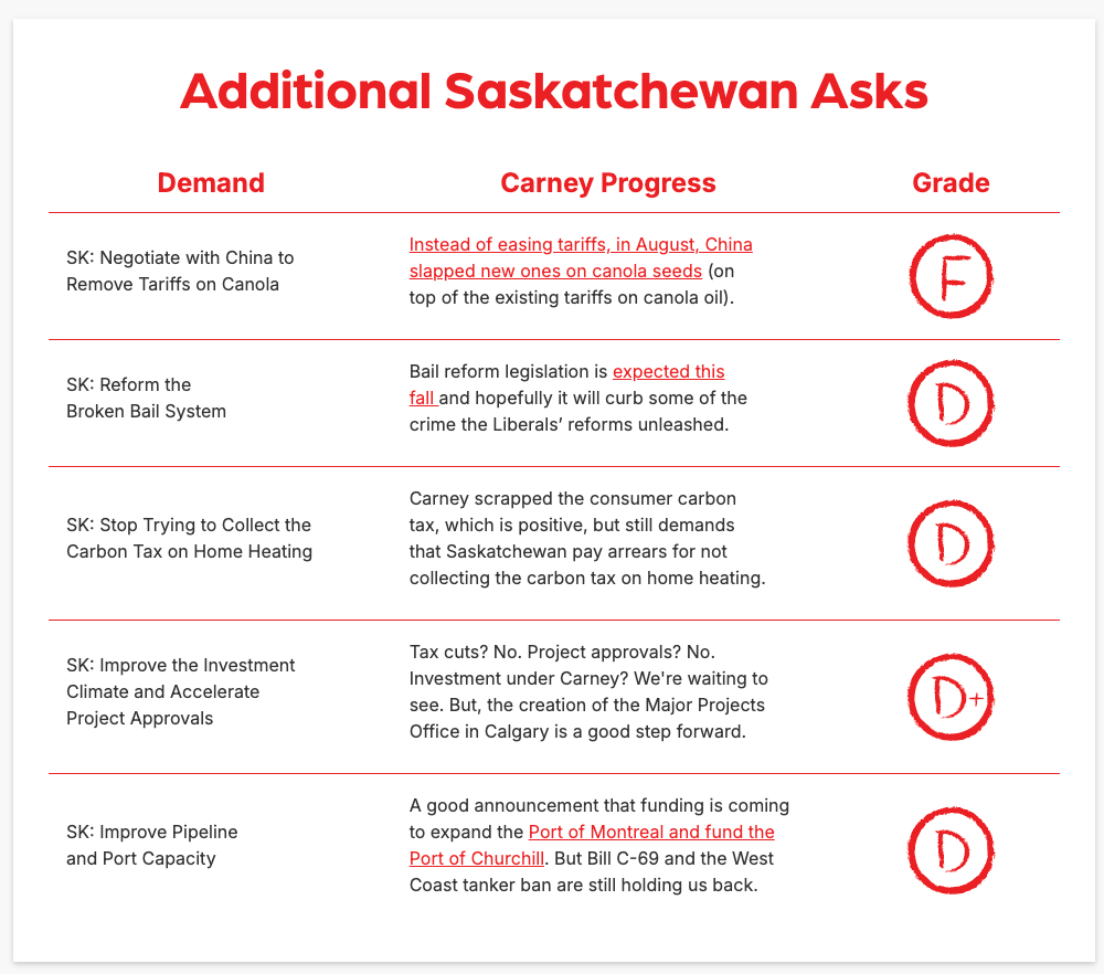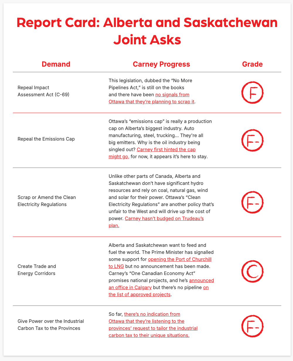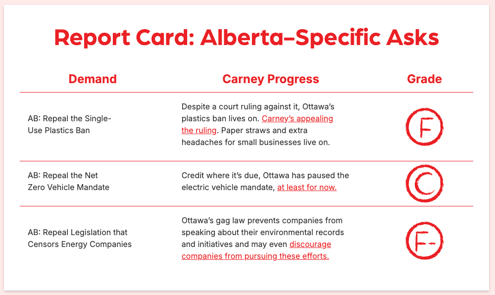 The campaign’s report card (ReportOnCarney.ca) graded Carney on the joint demands made by Alberta and Saskatchewan. While he mostly was given F’s and F-’s, he did get a C for creating trade and energy corridors.