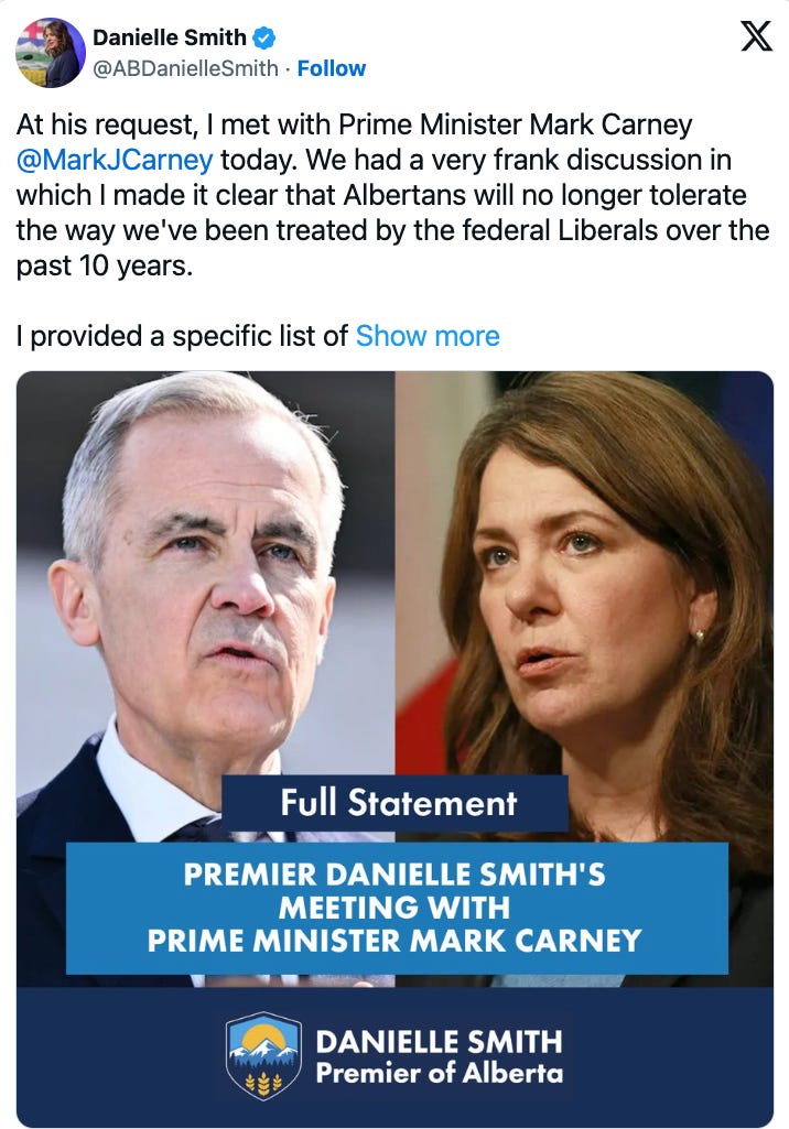 Alberta Premier Danielle Smith previously issued nine demands for Carney to accomplish in his first six months in office “to avoid an unprecedented national unity crisis.”