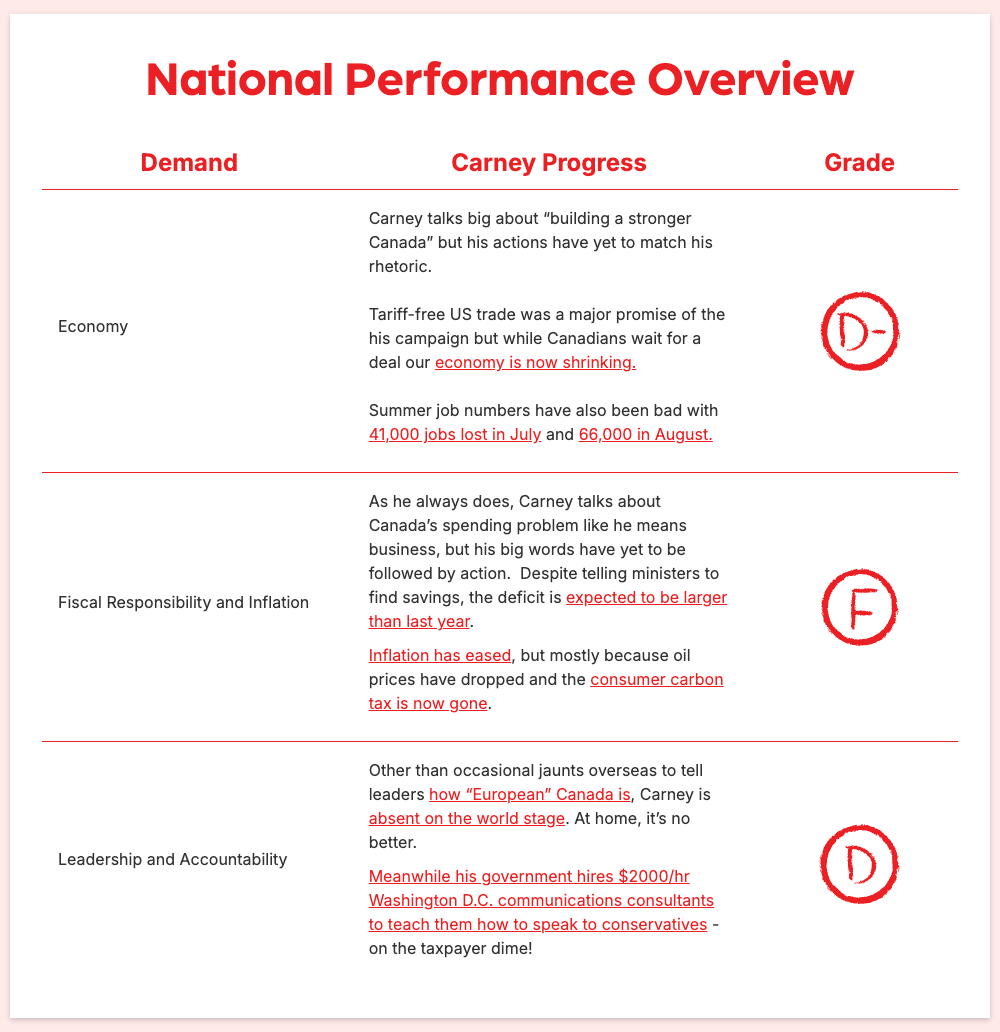 The campaign also graded Carney’s national performance, where he received a D in leadership and accountability, a D- in economy and an F in fiscal responsibility and inflation.