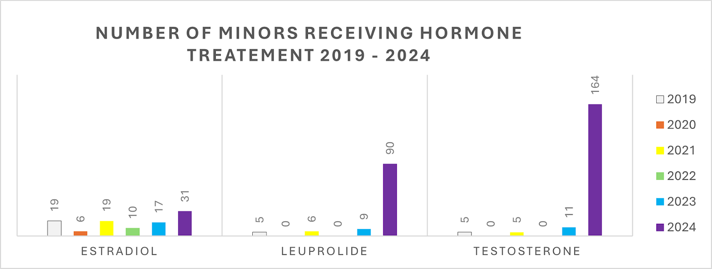This pharmaceutical regimen initiates irreversible physiological changes, including infertility and altered sexual development. The documents show a sharp increase in leuprolide and testosterone prescribed to young girls in 2024. The same dataset confirms that hormonal interventions are trending upwards for young girls in Nova Scotia’s health system.
