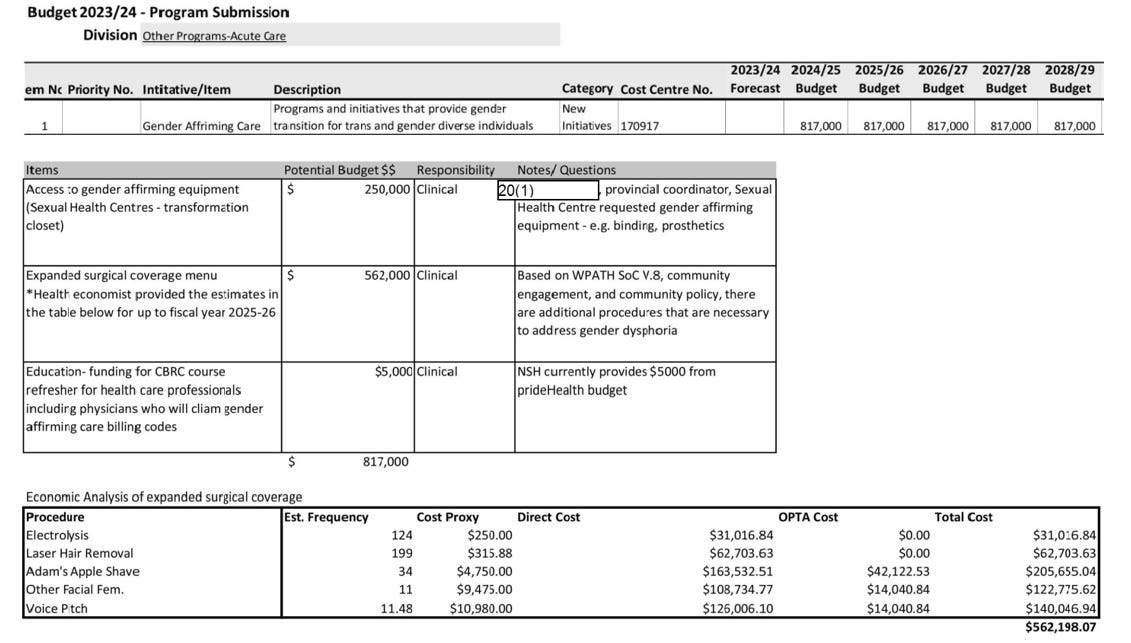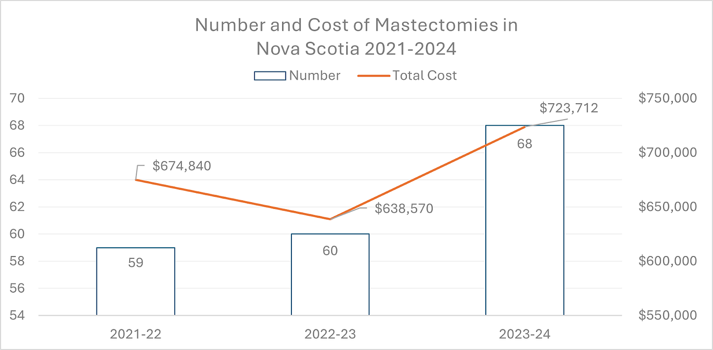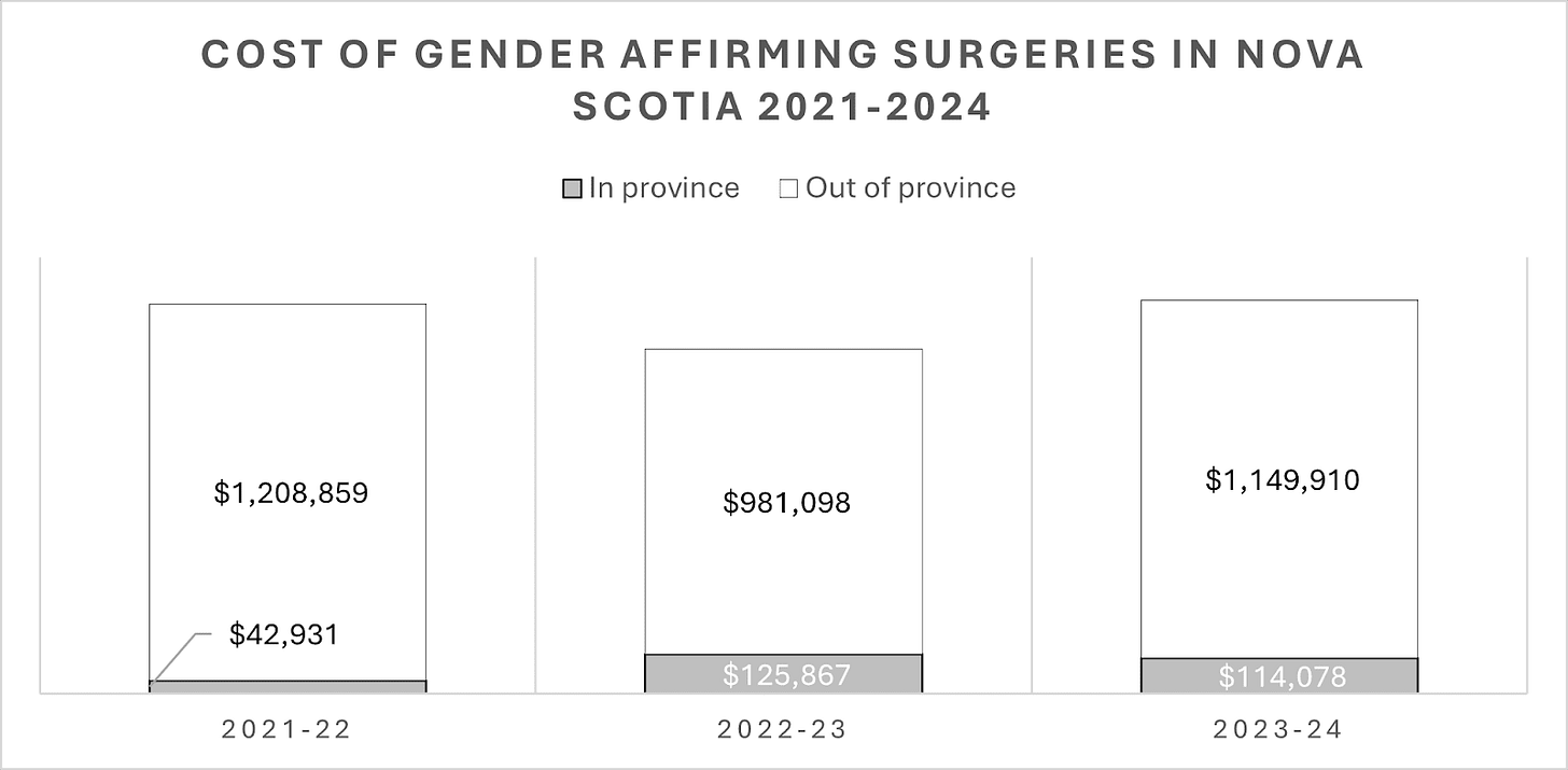 The costs associated with this care are significant. Nova Scotia budgeted $1.7 million for gender related health care in 2023–24 alone. That figure does not represent a fixed cap, as internal memos state that departments are encouraged to “adjust forecasts upward” if demand increases.