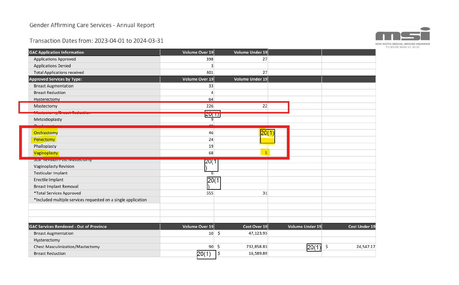 The 2023–2024 annual report from Nova Scotia’s the province’s health insurance program (MSI) reveals that five procedures to create a neo-vaginal canal were approved for patients under the age of 19. Additional procedures, including the removal of the penis and testicles, appear in the same age bracket but the actual figure remains suppressed under Section 20(1) of Nova Scotia’s FOIPOP Act, which exempts disclosure when the number of patients is fewer than five.