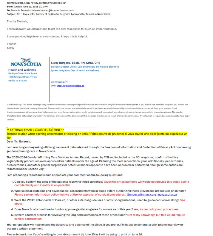 These changes were based on the World Professional Association for Transgender Health Standards of Care v8, a document that has come under global scrutiny for promoting early medical transition with limited evidence. In internal emails, Stacy Burgess, Executive Director of Clinical Care at Nova Scotia Health, admitted in May 2024 that she had only “skim read” WPATH v8 and hadn’t noticed anything of concern. This statement came two months after the release of the WPATH Files, an investigative exposé which documented internal dissent among the authors and raised alarms about the reliability of the organization’s standards.