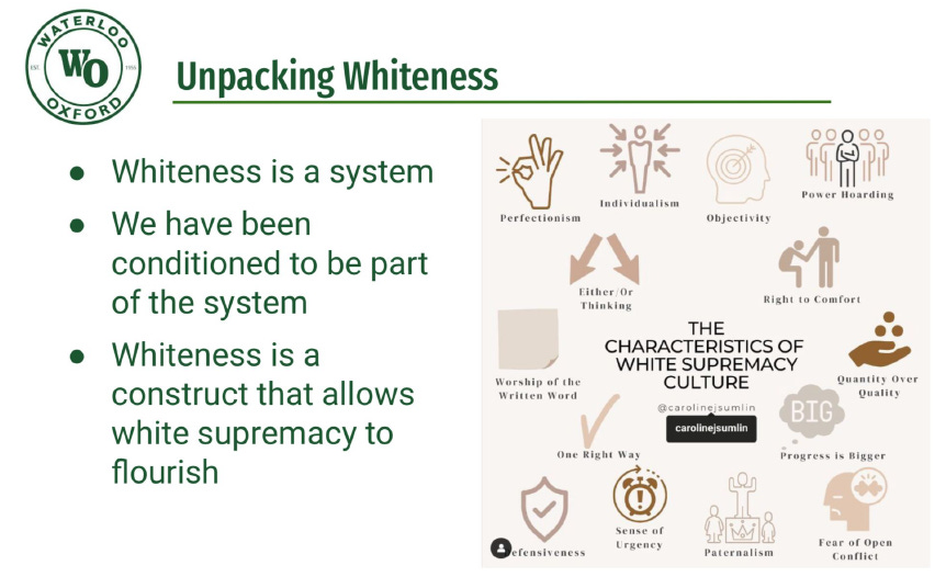 True North obtained internal training materials delivered to the staff at Waterloo-Oxford District Secondary School by the Ontario Secondary School Teachers Federation which assert that terms like “objectivity,” “perfectionism,” and “worship of the written word” are hallmarks of “Whiteness” and upholding white supremacy.