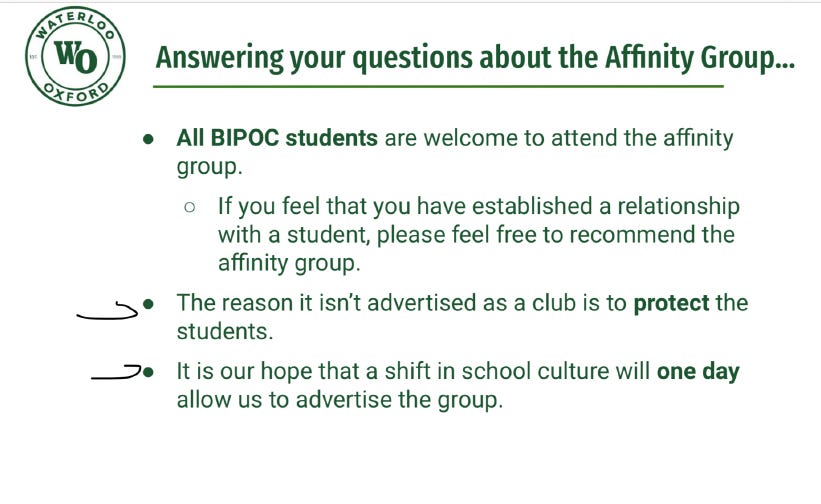 Another slide promotes the use of “BIPOC affinity groups,” described as exclusive, invitation-only spaces for non-white staff or students. These groups are deliberately kept confidential, justified by the claim that school culture is inhospitable to racial minorities. Despite their private nature, the groups are cited in WRDSB board meeting minutes and equity reports as markers of institutional progress.