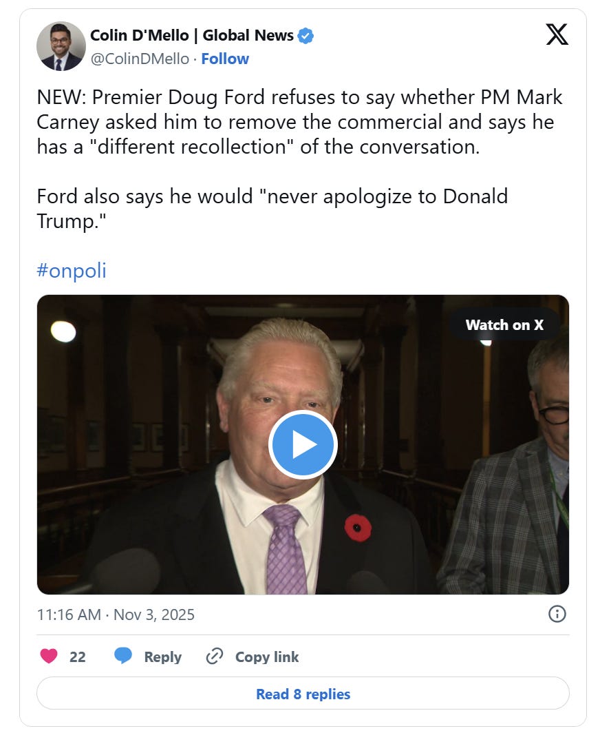 Because of the ad, which Ford said Carney and his chief of staff viewed before airing, Trump ended trade talks between the two countries and promised an additional 10 per cent tariff on Canadian imports.