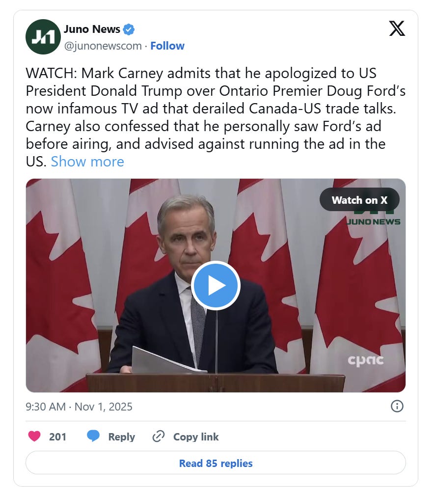 On Saturday, Carney told reporters in Malaysia that he apologized to Trump over the ad and that airing it was “not something” he would have done.”