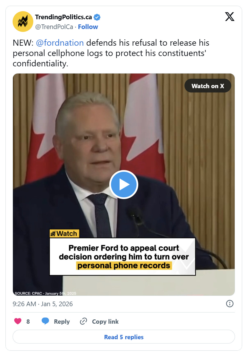 Ford’s office announced it would be “seeking leave” to appeal the decision, arguing that access to the premier’s personal phone records was an invasion of privacy and would lead to “speculation, gossip and innuendo” and “misinformation.”