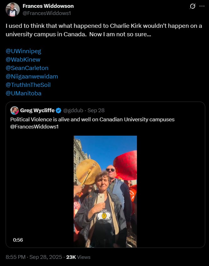 Chaos erupted at the University of Winnipeg last week when a crowd of protesters swarmed academic Frances Widdowson during her “Spectrum Street Epistemology” session, banging drums, shouting her down, and allegedly assaulting members of her team. One man filming the event was punched, a woman was spat on, and equipment was doused with water in a scene Widdowson later described as “a complete breakdown of civilization.”