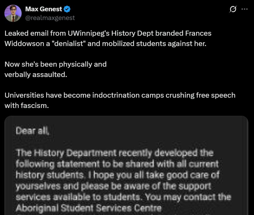 A day before the Winnipeg event, assistant professor Leah Kuragano sent an email to all history students labelling Widdowson an “Indian Residential School denier” and urging them not to engage with her. The email linked to a column by Niigaan Sinclair that described her tour as a distraction and accused her of profiting off controversy. Neither Sinclair nor Kuragano addressed her arguments directly.