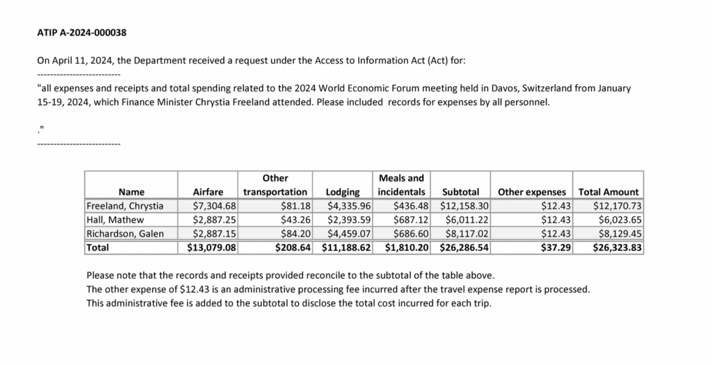 The records, obtained through an Access to Information request filed in June 2024 by former True North Journalist and Conservative MP Andrew Lawton, showed more than $26,000 in total costs for Freeland and two staff members to attend the globalist agenda-setting conference.