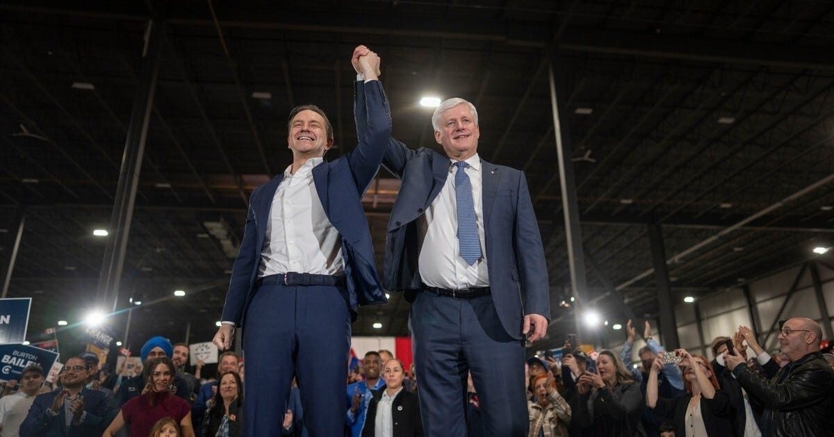 Harper backs Poilievre in official endorsement at Edmonton rally