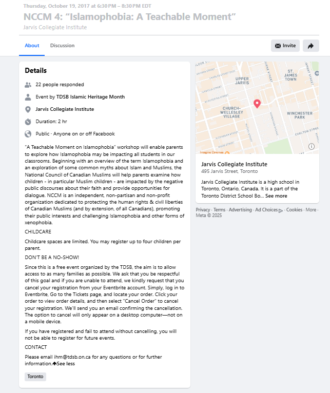 While NCCM pushed for the inclusion of Islamophobia in federal policy, it simultaneously worked to embed it at the school board level through the development of Islamic Heritage Month. The TDSB facilitated NCCM-led “Islamophobia: A Teachable Moment” workshops for parents, staff and students at schools.