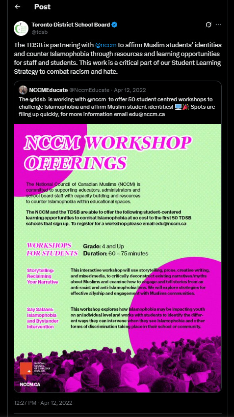 By the fall of 2017, the TDSB’s Islamic Heritage Month planning committee, which included NCCM advisors, launched workshops and events to address Islamophobia through equity and inclusion pathways. Amira Elghawaby, Canada’s Special Representative on Combating Islamophobia, was involved in developing the initiative. She and other “dignitaries” attended the launch, with Elghawaby praising “the sheer momentum” of parents behind the effort. She later joined a York University webinar panel, alongside TDSB human rights and equity staff, to discuss “disrupting and dismantling” discourses on “Islamophobia and Intersecting Oppressions including anti-Black racism in K-12 Schooling.”